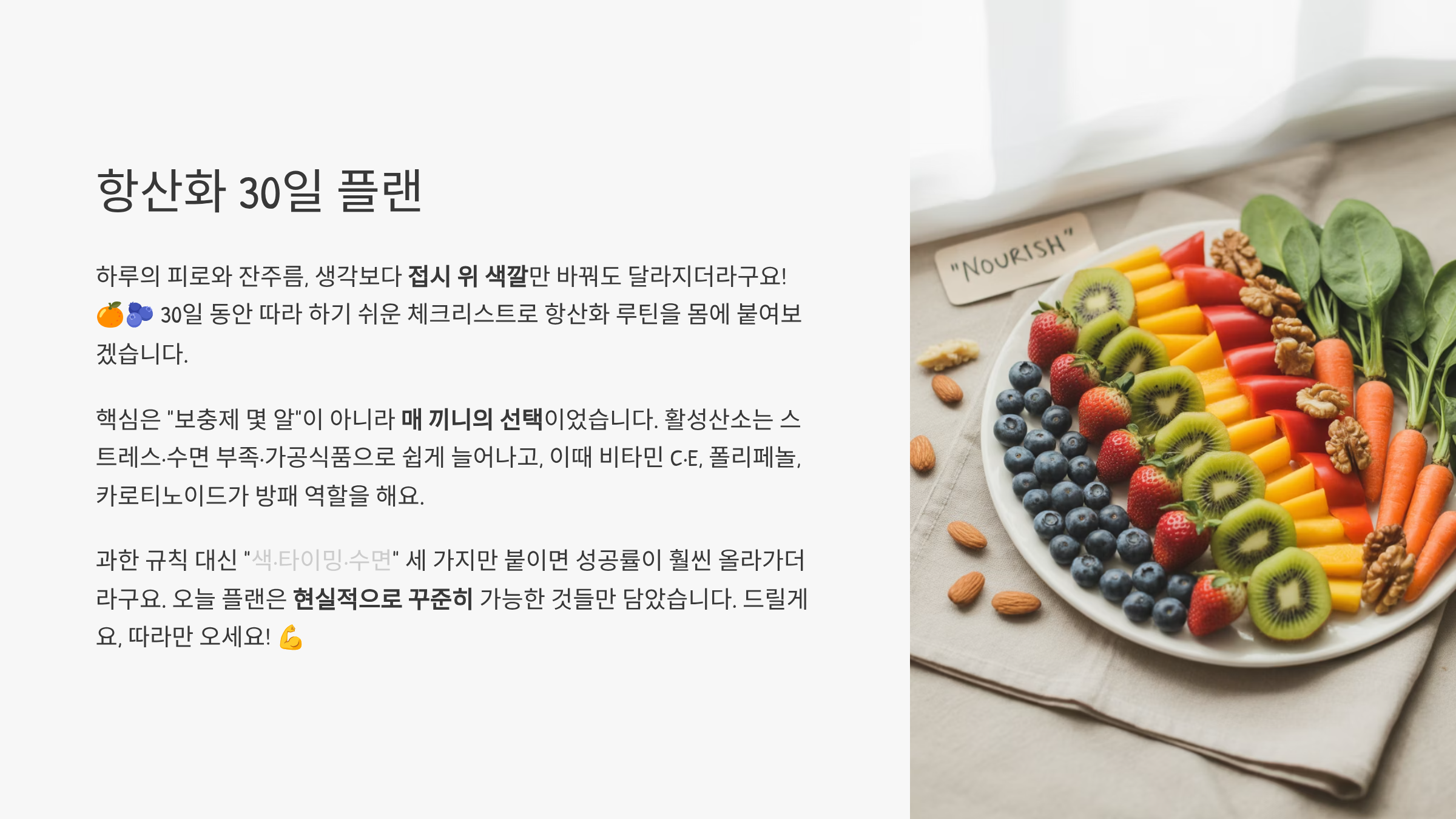 저는 이 4가지로 피부 톤·부종·집중력이 장기적으로 안정됐고, 폭식 빈도도 크게 줄었습니다. 다음 달엔 단백질·섬유질 업그레이드와 주 2회 등푸른생선으로 항염 스펙을 한 단계 더 올려보겠습니다. 하겠습니다—꾸준함이 진짜 항산화예요! 🔥