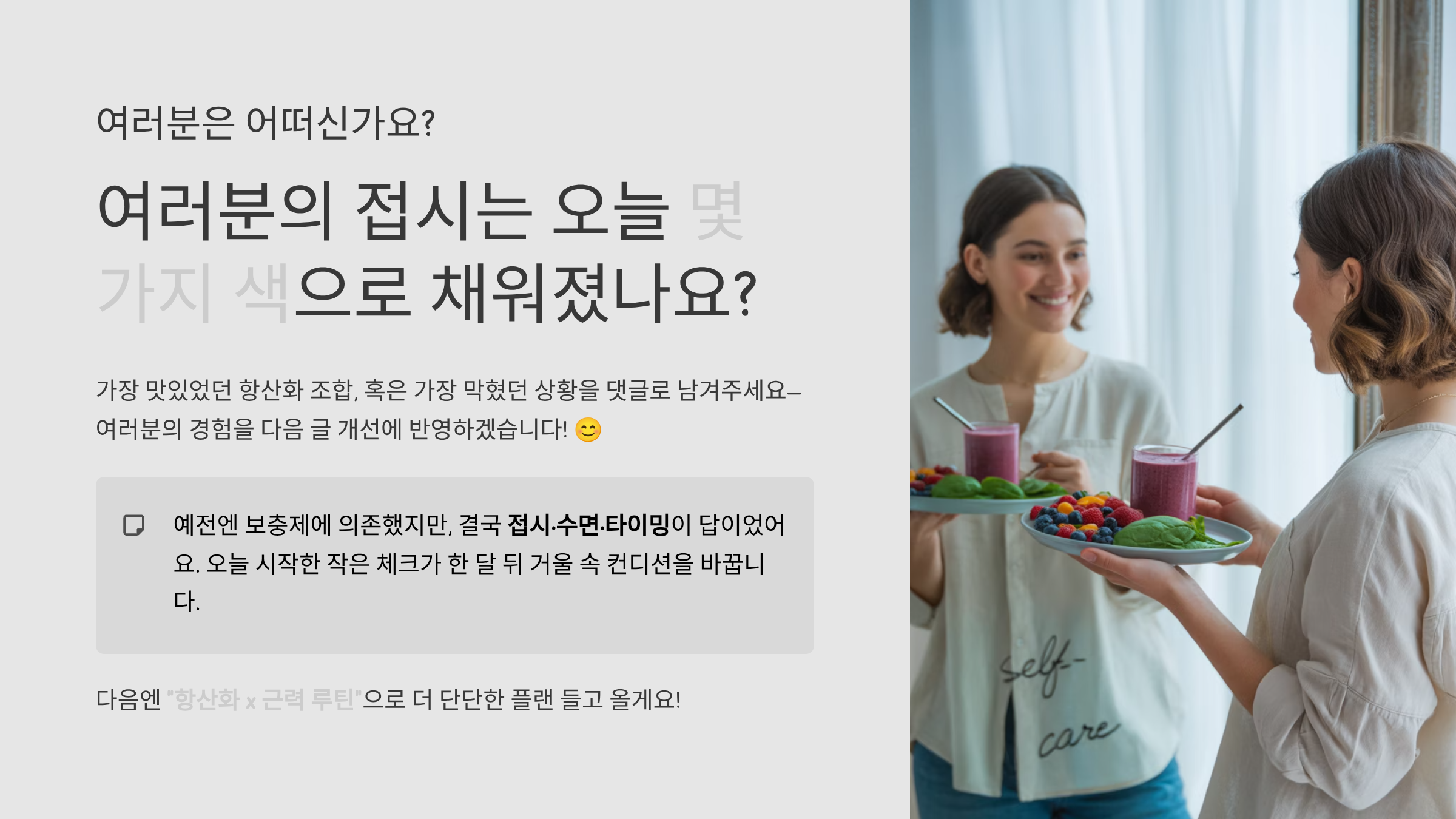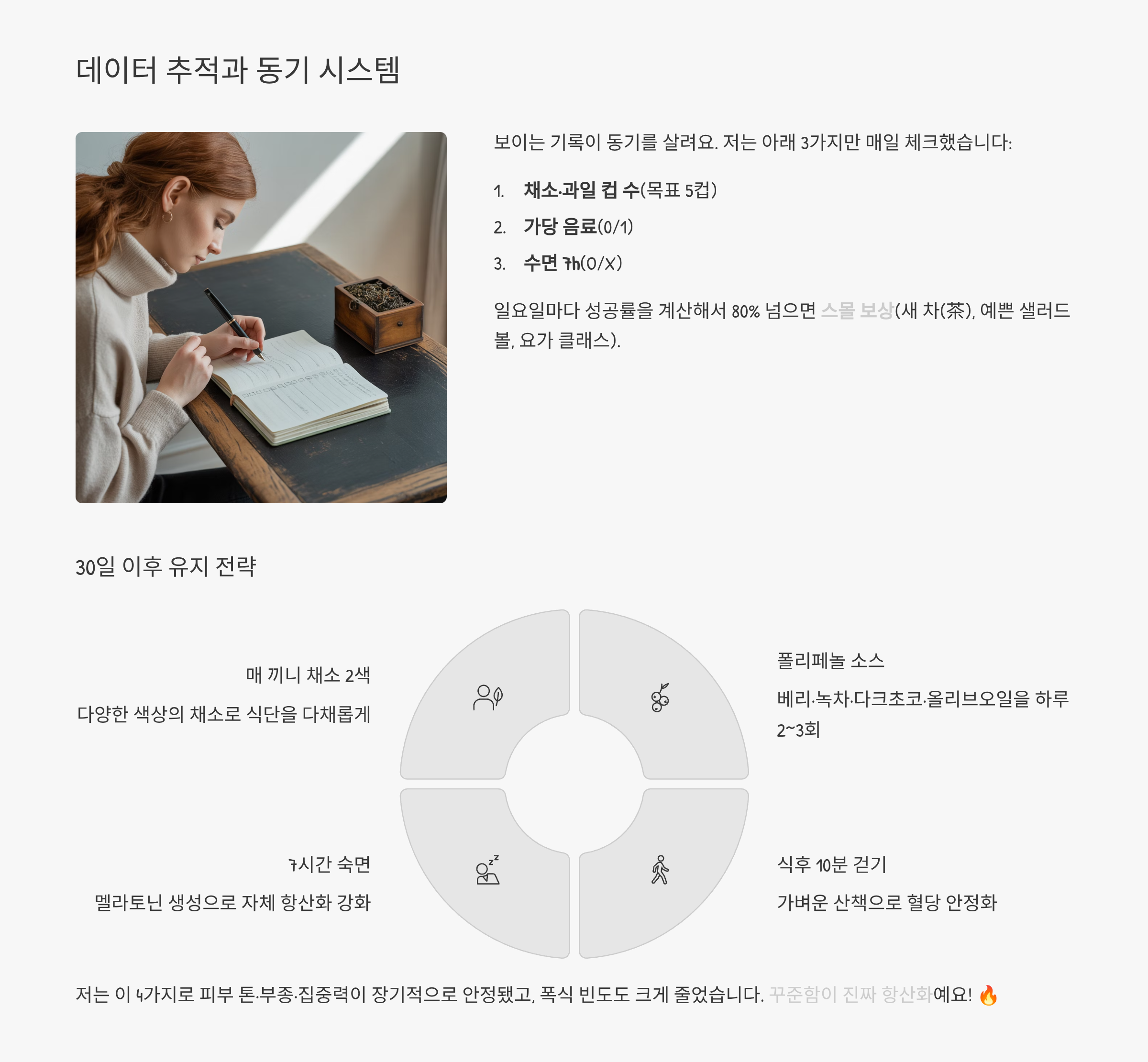 일요일마다 성공률을 계산해서 80% 넘으면 스몰 보상(새 차(茶), 예쁜 샐러드 볼, 요가 클래스). 실패한 주도 괜찮아요. 다음 날 첫 끼를 채소 2색+단백질로 시작하면 금방 궤도 복귀하더라구요. 그리고 한 줄 일기처럼 “오늘 가장 맛있었던 항산화 조합”을 적어두면 다음 주 메뉴가 자동으로 채워집니다. 📒✨