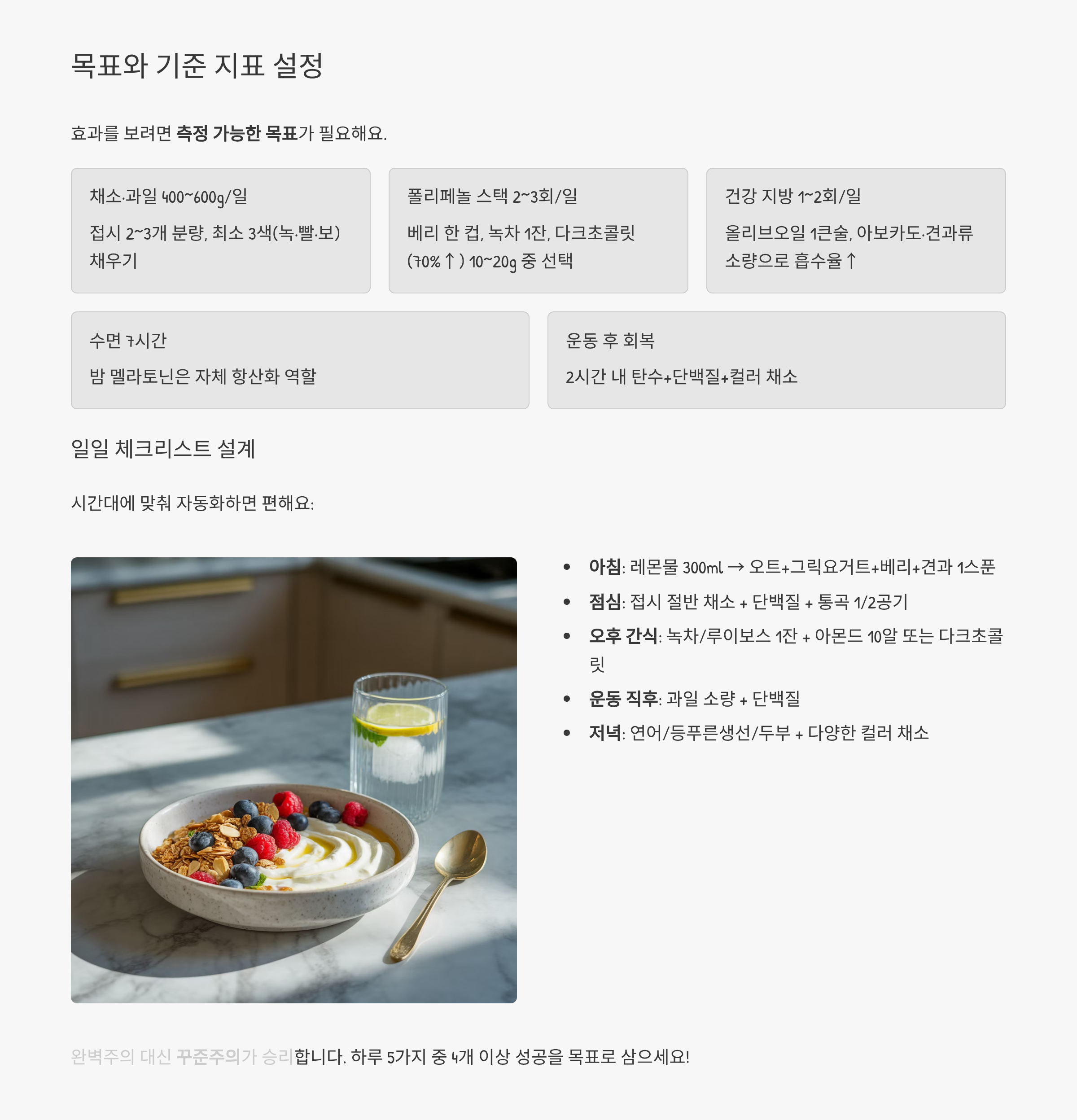 ① 매 끼니 채소 2색 ② 폴리페놀 소스(베리·녹차·다크초코·올리브오일) 하루 2~3회 ③ 식후 10분 걷기 ④ 7시간 숙면.