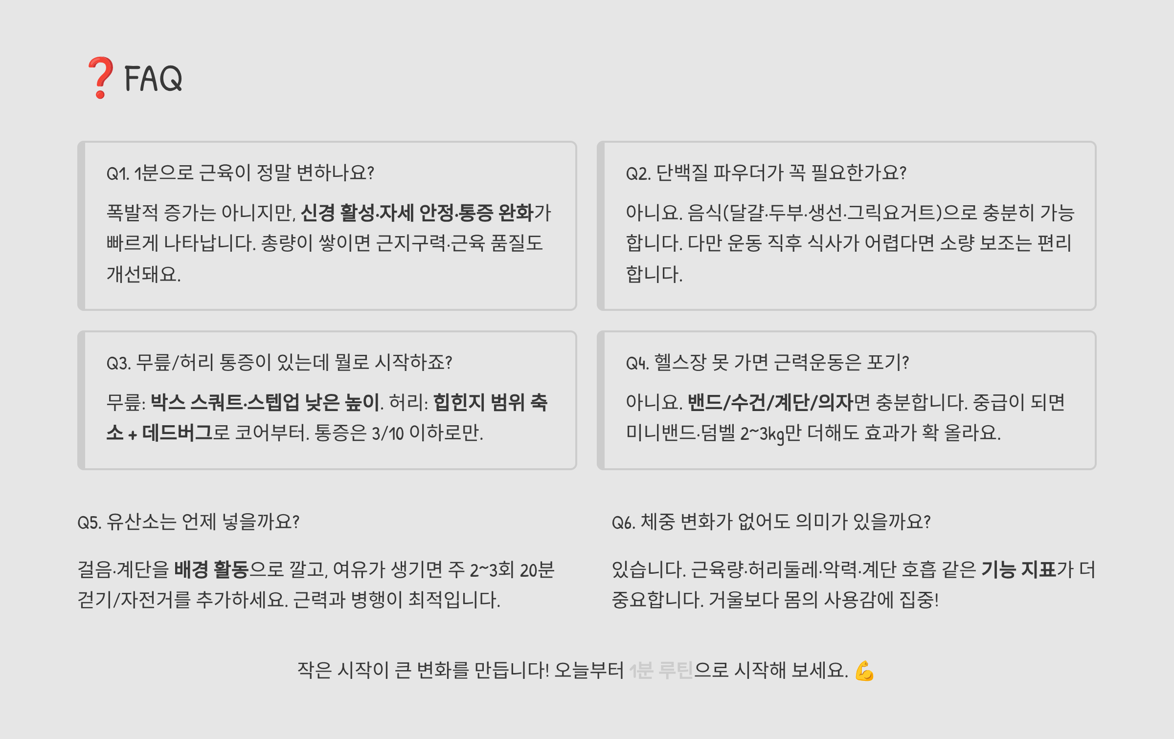 저도 예전엔 “시간 없어서 운동 못 한다”는 말을 입에 달고 살았어요. 그런데 짧지만 자주로 바꾸자 몸이 먼저 반응했습니다. 오늘의 1분이 한 달 뒤 탄탄한 기초 체력을 만듭니다. 하겠습니다—꾸준함으로! 🌙