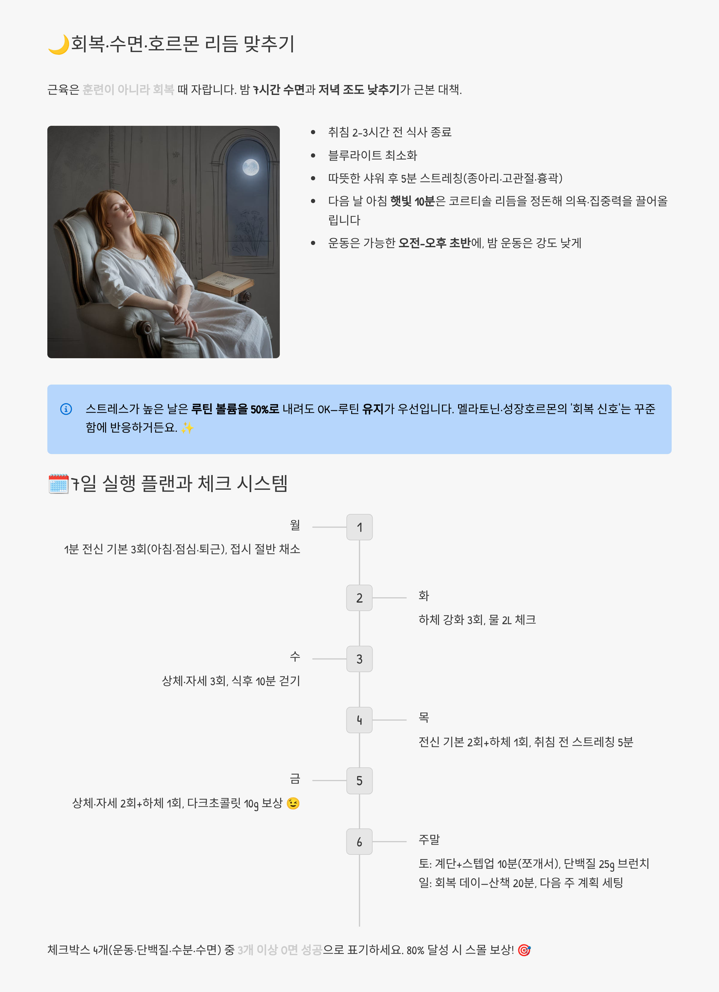 ~3시간 전 식사 종료, 블루라이트 최소화, 따뜻한 샤워 후 5분 스트레칭(종아리·고관절·흉곽)을 추천해요. 다음 날 아침 햇빛 10분은 코르티솔 리듬을 정돈해 의욕·집중력을 끌어올립니다. 운동은 가능한 **오전-오후 초반에, 밤 운동은 강도 낮게. 스트레스가 높은 날은 **루틴 볼륨을 50%로 내려도 OK—루틴 유지가 우선입니다. 멜라토닌·성장호르몬의 ‘회복 신호’는 꾸준함에 반응하거든요. ✨