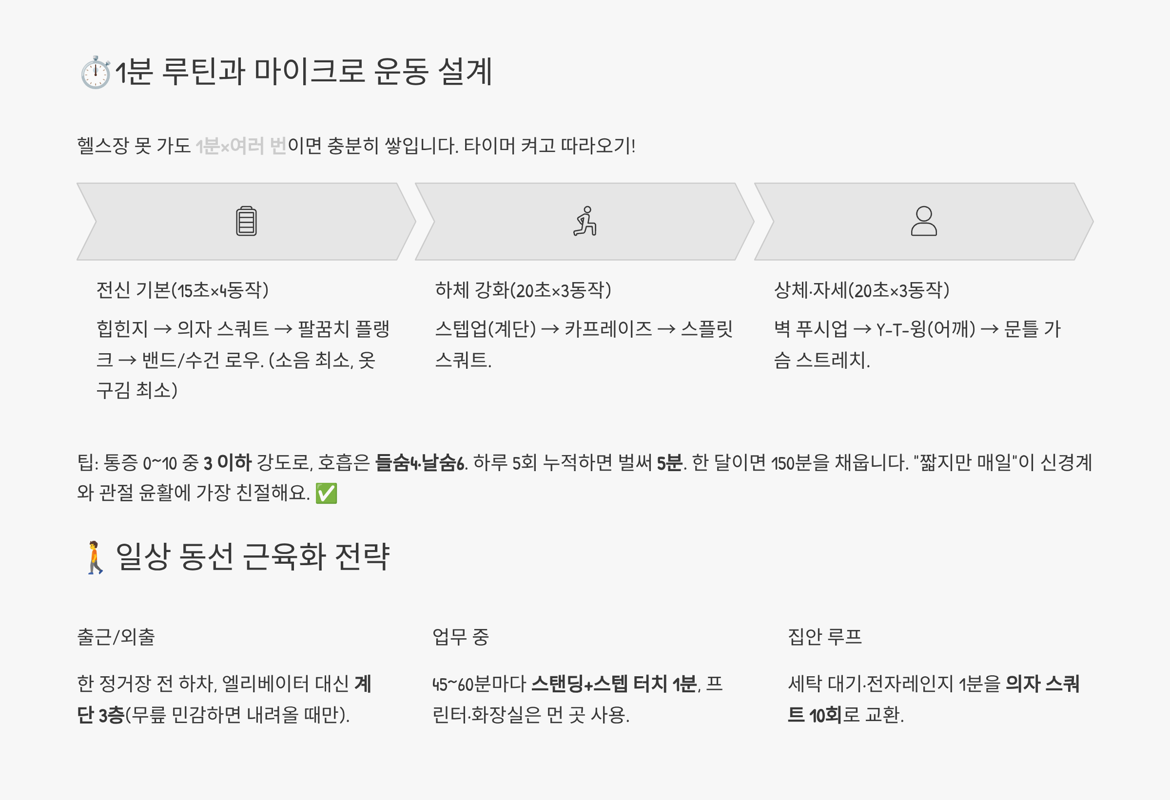 헬스케어 어렵지 않습니다. 하루 시간 쪼개고 동작만 간소화하면 근육은 금방 반응합니다. 저는 ‘1분×여러 번’과 ‘접시 반 채소+단백질’ 원칙으로 허리 뻐근함이 사라지고 계단이 가벼워졌어요. 오늘 근육 건강을 간단 방식으로 챙기는 실전 로드맵 드릴게요! 💪