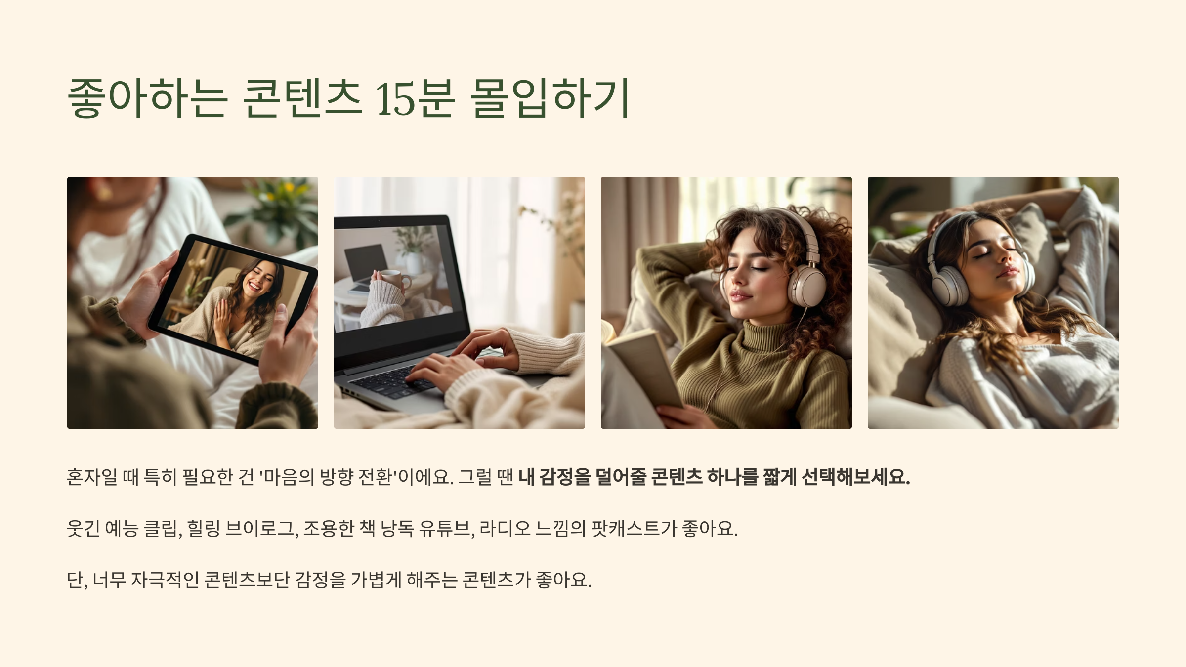 혼자일 때 특히 필요한 건 ‘마음의 방향 전환’이에요.