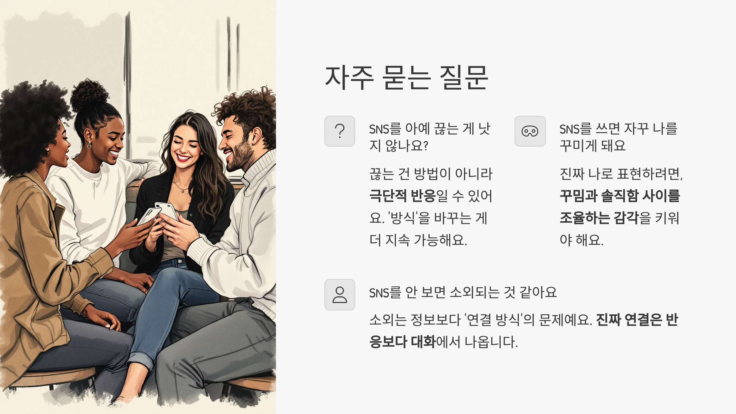 진짜 연결은 반응보다 대화, 피드보다 관계에서 나옵니다.