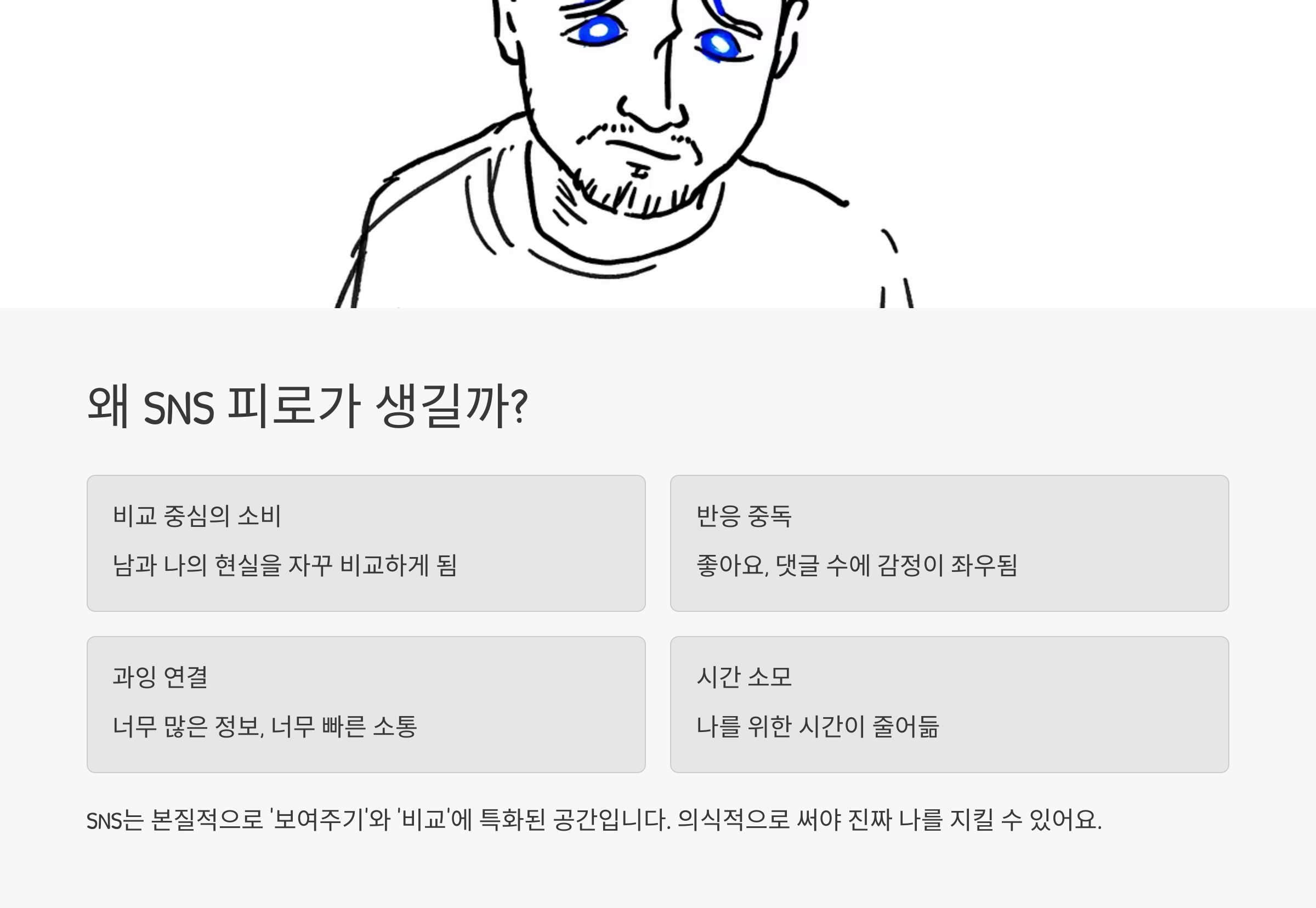👉 SNS는 본질적으로 ‘보여주기’와 ‘비교’에 특화된 공간입니다.